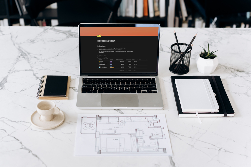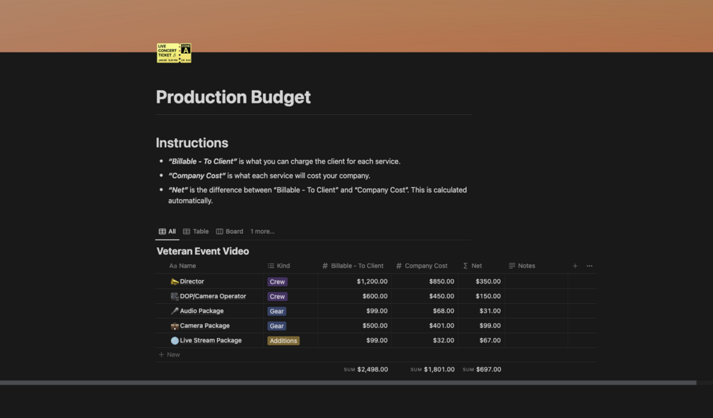 Make budgets a breeze with this is simple Production Budget Notion template. Quickly jot down the prices of your billable cost to the client and cost of that service for your company and voila! Your net income is automatically calculated using a formula.